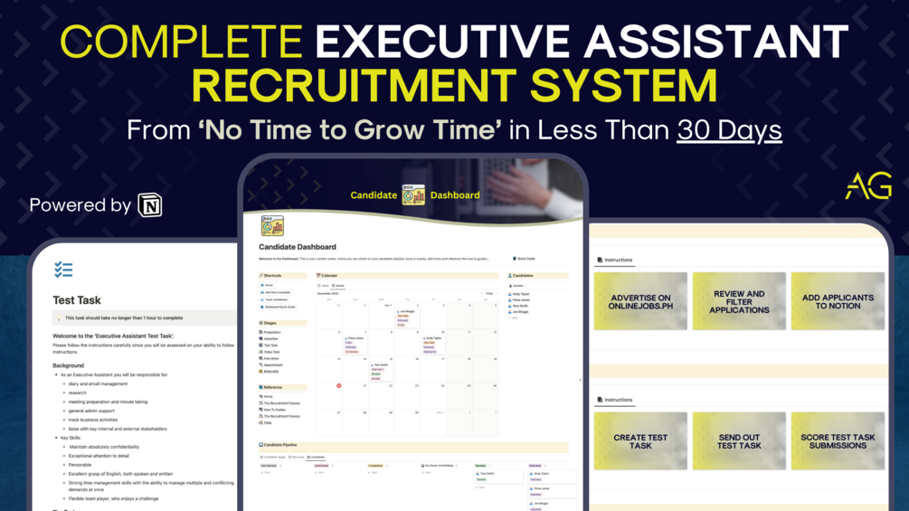I've been there and know how it feels. That's why I've created the 'Complete Executive Assistant Recruitment System'. Built from years of experience, it contains everything you need to find an AMAZING Executive Assistant, to free up your time so you can focus on your most important work.