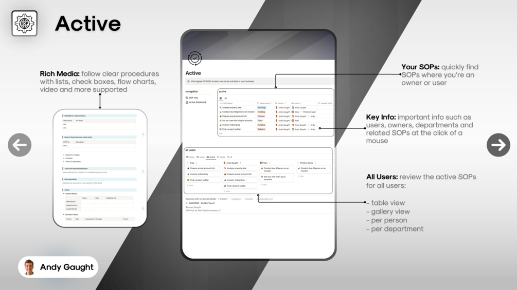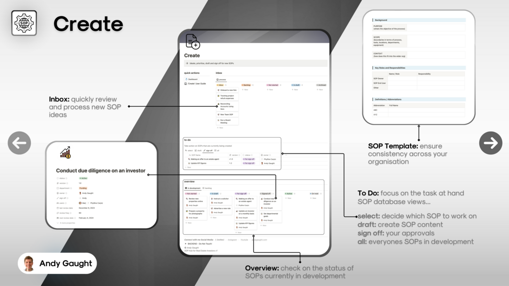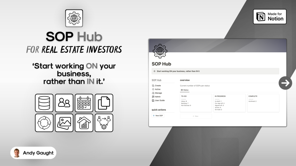 The 'SOP Hub for Real Estate Investors' makes it easy to capture SOP ideas, track them through the development process, collaborate with team members, create easy to follow processes and review them on a regular basis.
