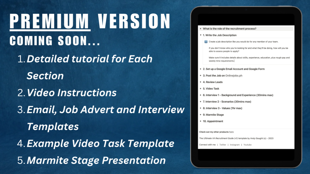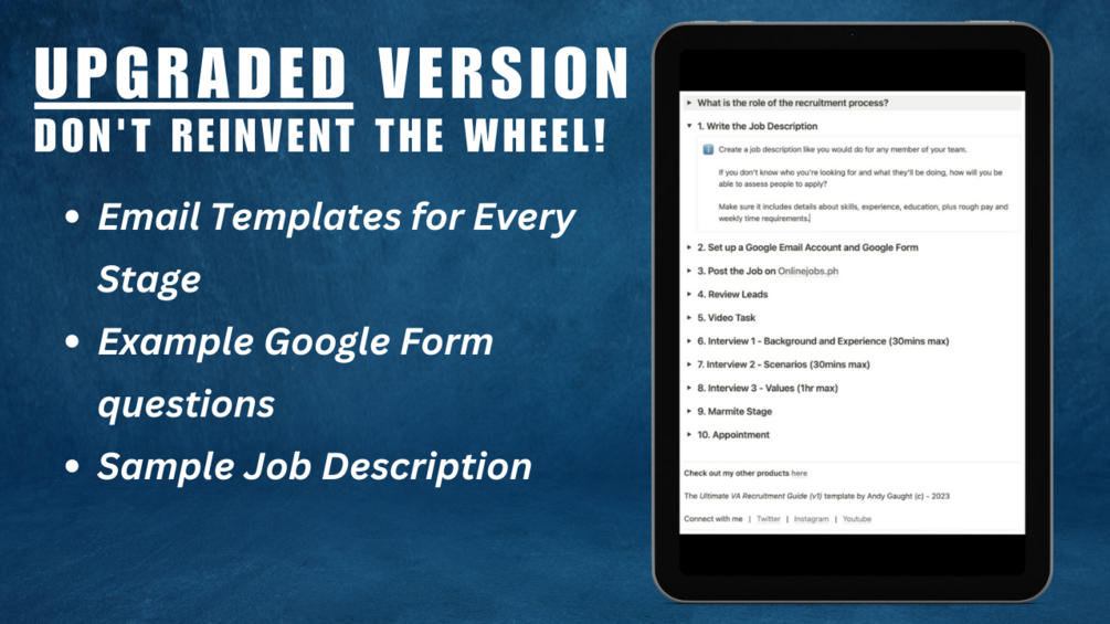 Don't reinvent the wheel - in this version you can grab my sample email templates for each stage of the process, plus check out example Google Form questions AND sample Job Description.