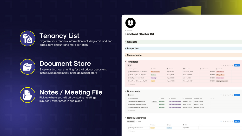 The Notion Landlord Starter Kit is an easy to use Notion template built to help you store and organise your property, contact, tenancy, maintenance and other information in one place. -