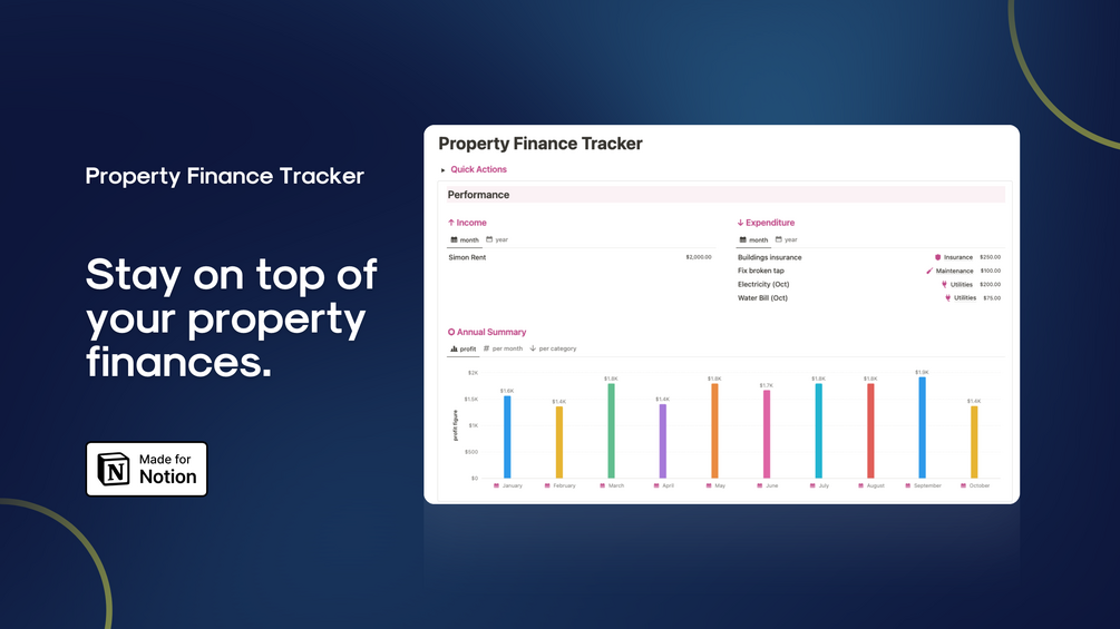 This easy to use Notion page provides a simple way to track income and expenses for an individual property.