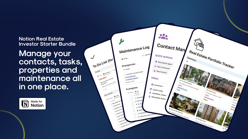 Notion Real Estate Investor Starter Bundle is a collection of 5 starter templates for Notion, designed to help property investors get started building their own workspace.